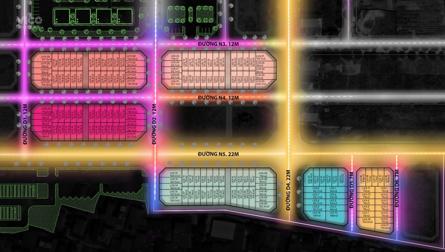 - Diện tích nhà phố, liền kề: 75-120m2.