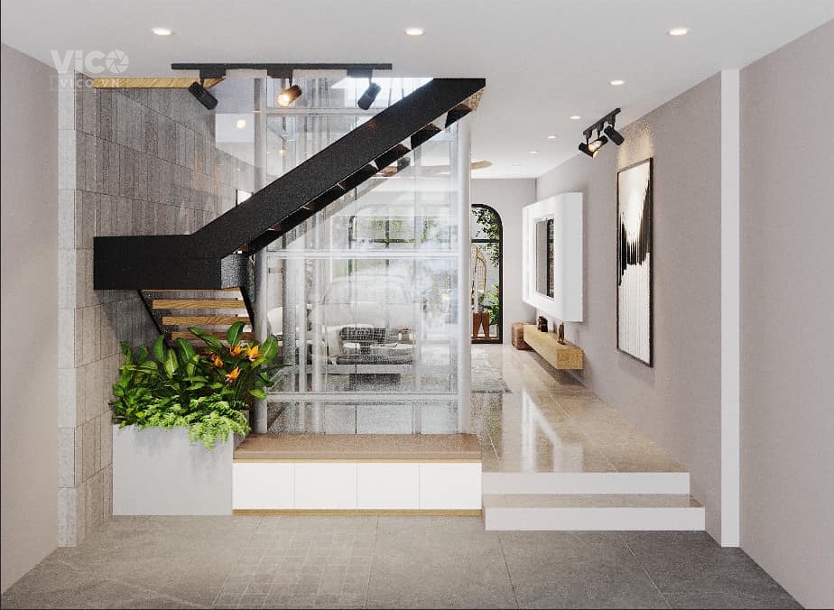 👉Nhà được thiết kế theo phong cách hiện đại, đường nét gọn gàng, nhưng tinh tế, có bố trí khe thoáng phía sau nhà, nên phòng nào cũng đều cực kỳ thoáng, sáng. Ngôi nhà có điểm nhấn là hệ cầu thang máy toàn kính, cho phép gia chủ ngắm toàn cảnh nhà khi lên xuống.