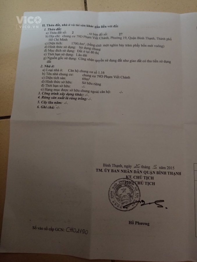 Chính chủ cần bán đất vị trí đẹp tiền năng cao tại TP Hồ Chí MinhĐịa Chỉ : Chung Cư 79 D Phạm Viết Chánh – Phường 19 – Quận Bình Thạch – TP. Hồ Chí MinhGiá bán: 2 tỷ 700 tr ( có bớt lộc cho khách mua )Diện tích: 1700.4 m2 ( đất đô thị )+ Đất view đẹp,thuận tiện di chuyển khu vực lân cận+ Giao thông thuận tiện đi lại dễ dàng+ Tiện ích xung quanh đầy đủ+ khu vực tập trung dân cư đông đúc ,khu an ninh đảm bảo.+ Pháp lý đầy đủ sang tên nhanh chóng ( chính chủ )+ Tiềm năng lớn: Đất luôn tăng giá theo tình hình hiện tại chung của BĐS của khu vực .MỌI NHU CẦU VUI LÒNG LIÊN HỆ : 0789988879 Ms. Tú Cúc ( mong Tiếp khách thiện chí)