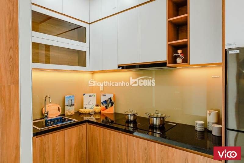 Bếp thiết kế hở nhưng rất kín đáo, từ bếp có thể nhìn và quan sát mọi góc ngách của căn hộ, tuy vậy từ phòng khách khó quan sát không gian trong bếp.