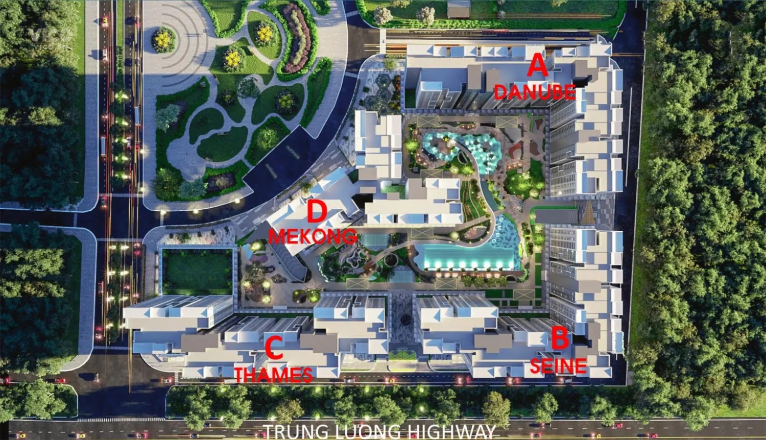 - Tổng Diện Tích: 3.1ha gồm 4 block, mỗi block cao 20 tầng.