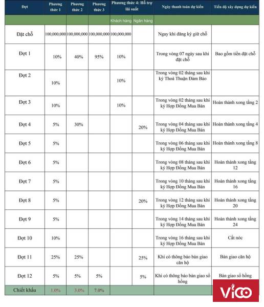 ĐÓNG TIỀN THEO TIẾN ĐỘ CHIA LÀM 12 ĐỢT TRONG VÒNG 24 THÁNG VỚI ỮU ĐÃI CHIẾT KHẤU LÊN TỚI 7% GIÁ TRỊ CĂN HỘ