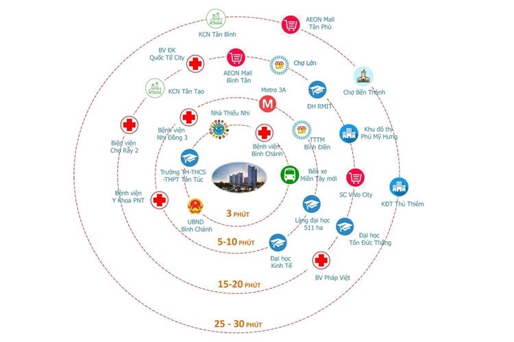 - Di chuyển: 5 - 10 phút đến TT hành chính, nhà thiếu nhi, BV Bình Chánh, BV Nhi Đồng 3, cụm Trường tiểu học Tân Túc, trường trung học, cụm làng đại học. Tất cả các tiện ích đã hiện hữu.