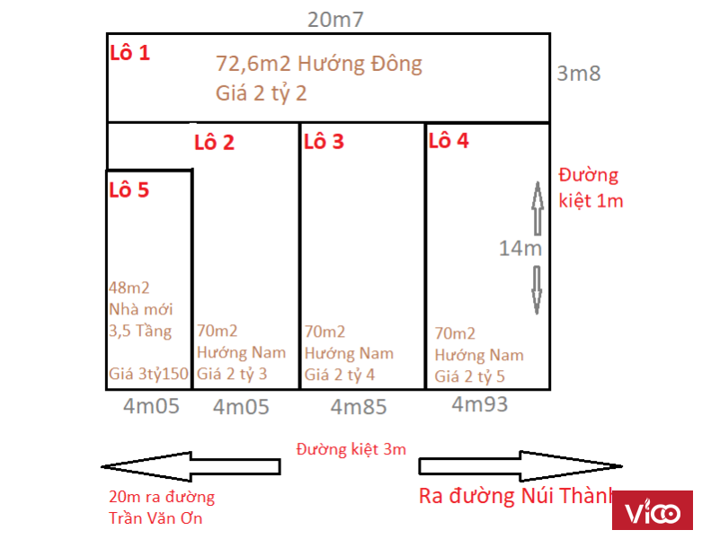Lô 5 : Ngang 5m, Diện tích 48m2. Mặt kiệt 3m. Hướng Nam : giá 3 tỷ 150 ( Đã xây nhà 3,5 tầng )