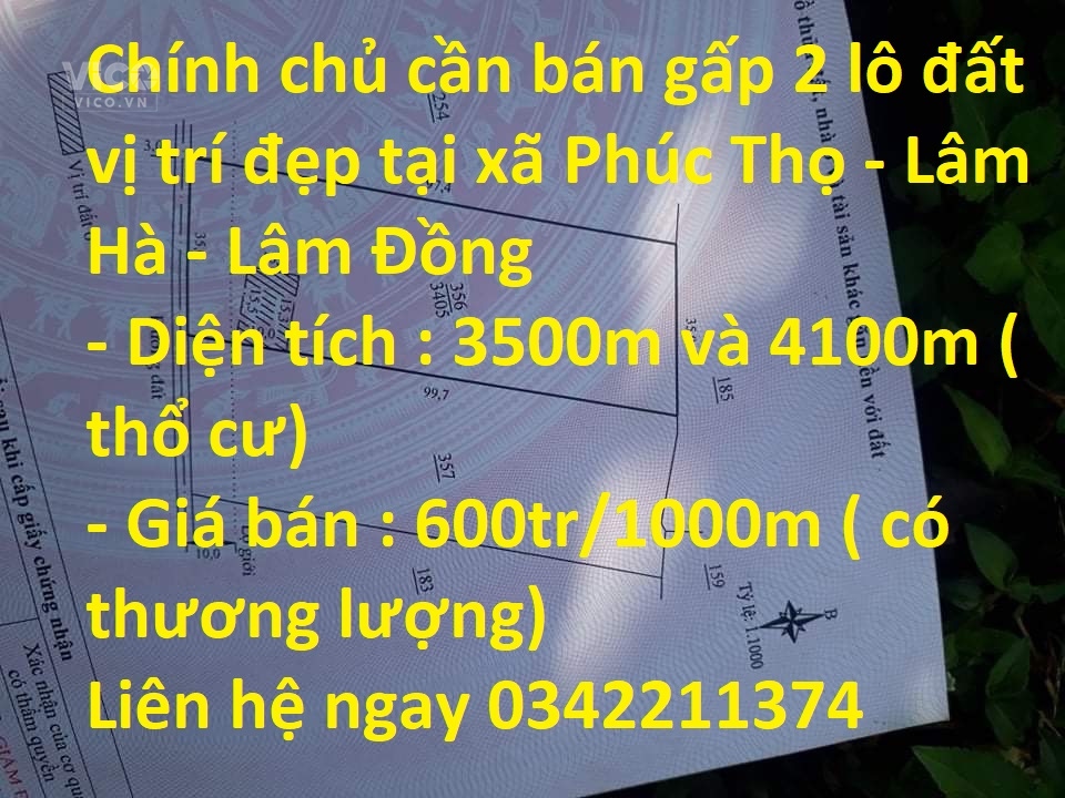 Chính chủ cần bán gấp 2 lô đất vị trí đẹp tại xã Phúc Thọ – Lâm Hà – Lâm Đồng– Diện tích : 3500m và 4100m ( thổ cư)– Giá bán : 600tr/1000m ( có thương lượng)– Đất vị trí đẹp, view gần hồ lớn– Đường rộng thông thoáng , xe cộ đi lại thoải mái– Gần nhiều tiện ích xã hội– Dân cư văn minh, thân thiện, an ninh đảm bảo– Pháp lí rõ ràng, sang tên nhanh– Tiềm năng lớn : đất luôn tăng giá theo tình hình chung của bđs từng khu vực, đầu tư sinh lờiLiên hệ ngay 0342211374 để biết thêm thông tin