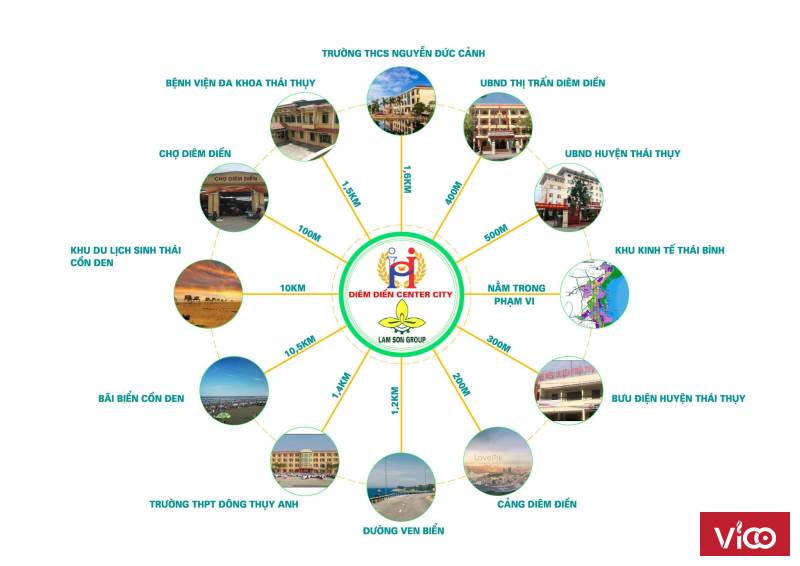 - Giáp: Chợ - Cảng Diêm Điền - Bệnh viện - Trường học - Khu hành chính