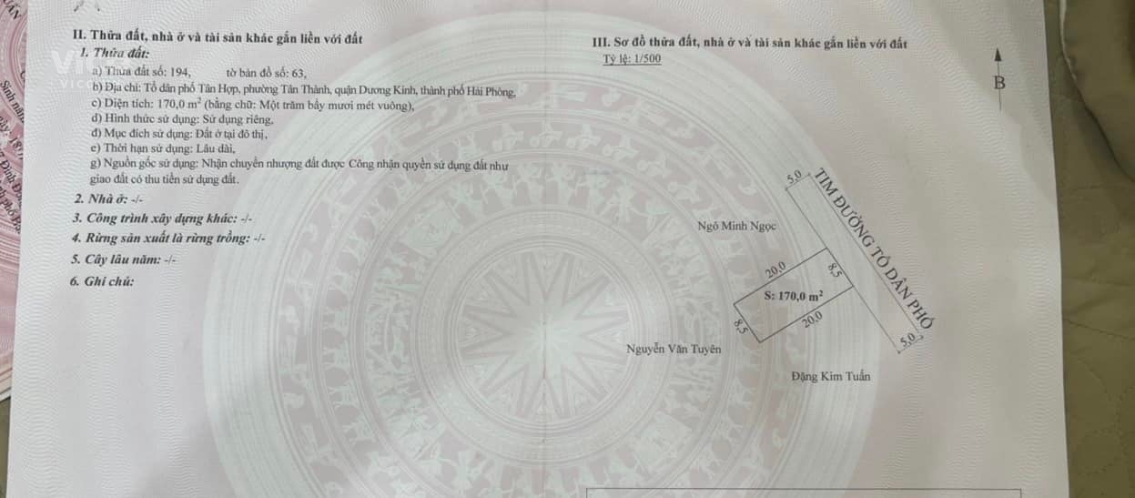 - Diện tích 170m2,mặt tiền 8,5m,hướng Đông Bắc.