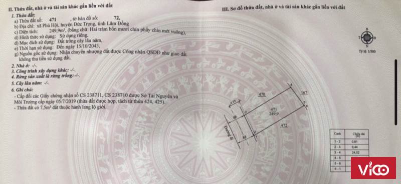Lô 2: Diện tích: 249,9m2 (9,44x26,4m) ; Giá bán: 1 tỷ 790 triệu (Thương lượng)