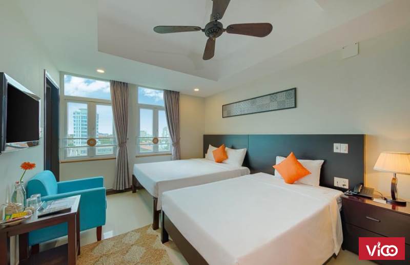 - Khách sạn hai mặt tiền nằm trên đường Trần Bạch Đằng, đường sát biển Mỹ Khuê, Mỹ An.
