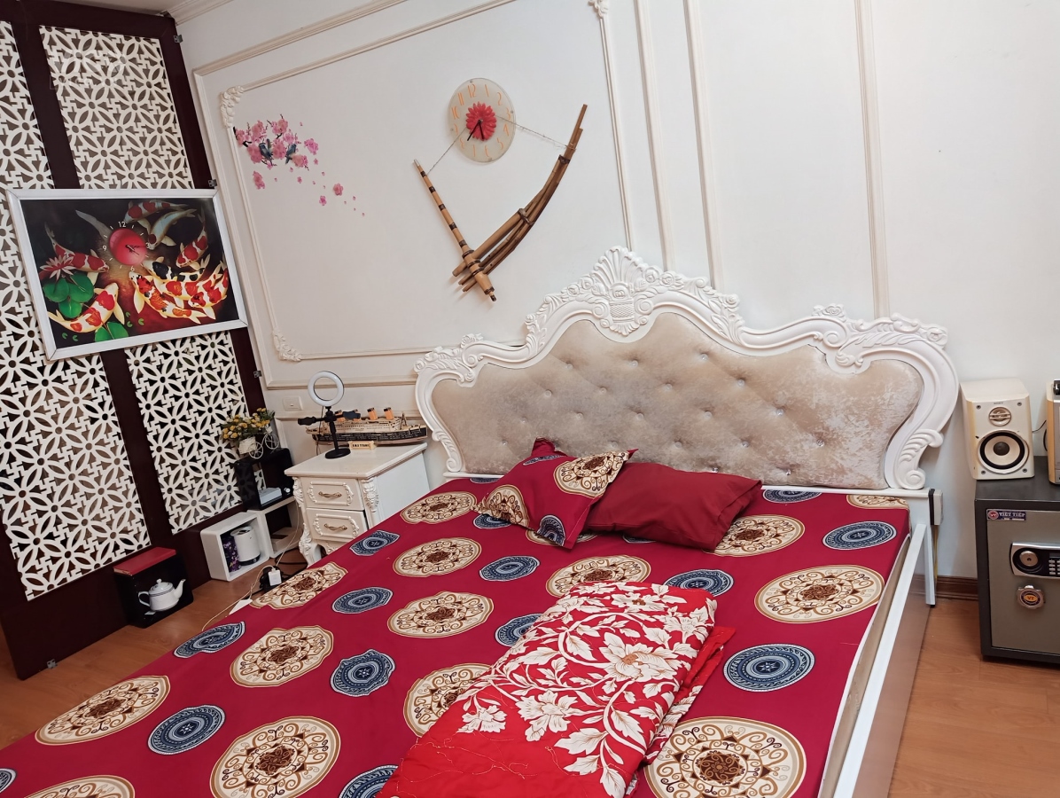 + Nhà thiết kế 5 tầng khung cột bê tông chắc chắn, đẹp long lanh, đầy đủ công năng nội thất xịn sò với thiết bị vệ sinh to to, phòng tắm kính, cửa và cầu thang đều làm từ gỗ tốt. Nội thất phòng ngủ sang trọng và hài hoà.