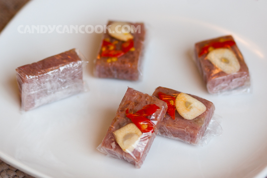 - Cách 2: cho tất cả chỗ thịt và dùng một miếng giấy plastic wrap to để gói lại thành hình vuông hay chữ nhật tùy cả nhà (giống trong hình). Sau đó dùng cây cán bánh cán qua cán lại cho miếng nem chua cứng lại. Càng cán, cả nhà sẽ thấy thịt hồng trở lại đấy :D. Sau đó mở miếng giấy ra, xếp tỏi, ớt lên một mặt của miếng thịt rồi gói lại và để nguyên. Khi nào ăn thì cắt ra thôi :D … Còn muốn cầu kì thì cả nhà cắt thành từng miếng nhỏ, rồi lại gói mỗi miếng đó với 1 miếng ớt, một miếng tỏi :D Làm cái này hơi mệt nhưng trình bày đẹp và khi nào có party thì đỡ tranh nhau hehe … Hôm nọ tớ gói 60 cái nhỏ mà mất 2 tiếng đấy :-s