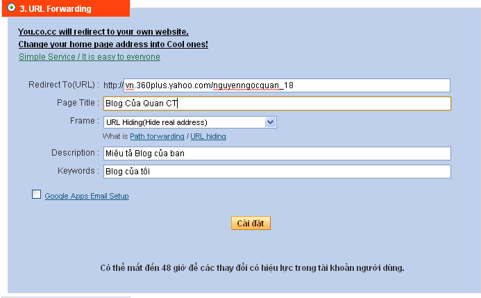 Chú ý: sau khi tạo xong tài khoản, bạn cần tiến hành cài đặt cho tên miền trong vòng 48 giờ, nếu không tài khoản của bạn sẽ bị xóa