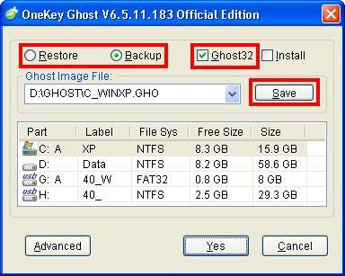 - Bấm nút Save để bạn chọn nơi sẽ lưu file Ghost (nếu bạn không chỉnh ở đây nó sẽ tự chọn là D:GHOSTC_WINXP hay 7 và nó tự ẩn)