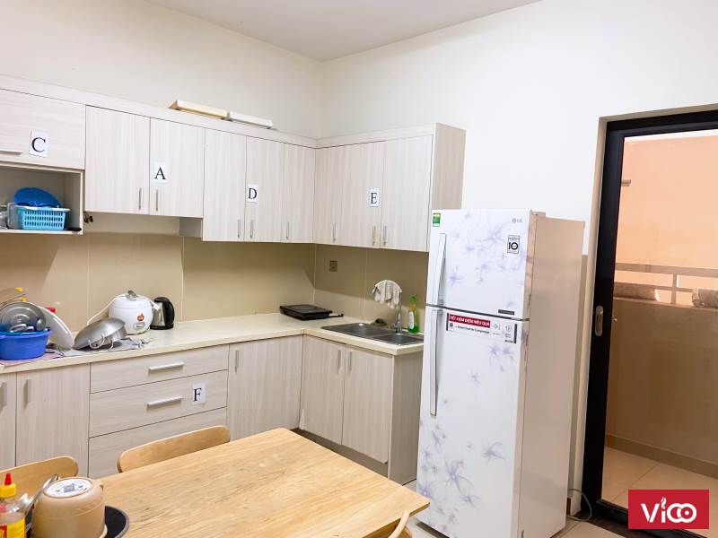 - Bếp chung có trang bị tủ lạnh máy giặt bếp từ, giàn phơi đồ, ngăn bếp riêng từng phòng.