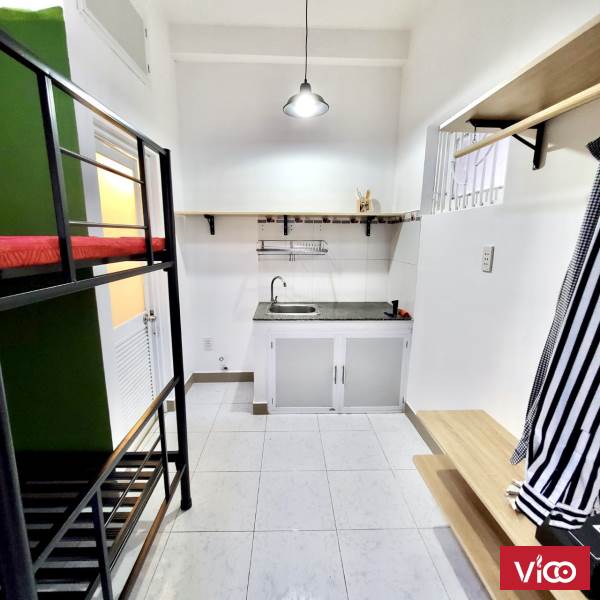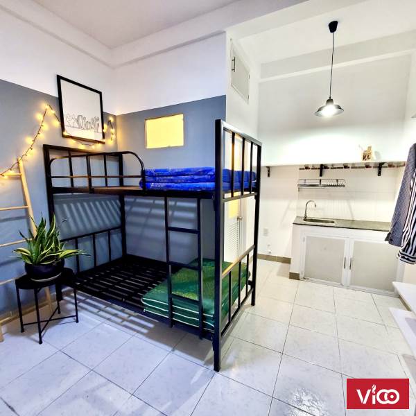 - Phòng đã có bàn, ghế, tủ kệ, giường tầng, máy lạnh, tủ lạnh, toilet riêng, kệ bếp, có cửa sổ và ban công thoáng mát, ban ngày không cần bật đèn.