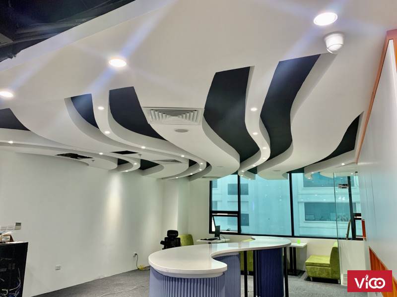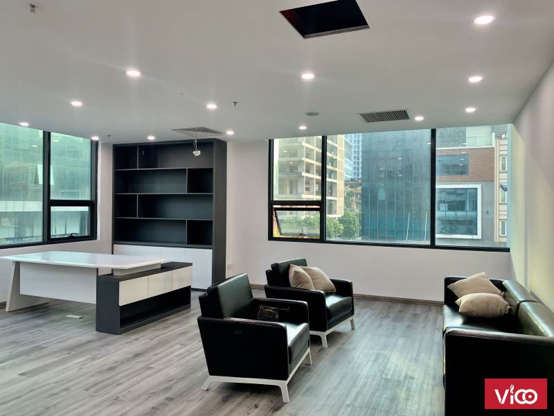 Mặt bằng vuông vắn, không có cột to chắn giữa nên rất dễ bố trí mặt bằng, view kính thoáng đãng và nhiều ánh sáng, sàn Gỗ và thảm còn mới tinh, trần thạch cao design theo xu hướng mới, trong phòng còn bố trí nhiêu mảng cây xanh rất đẹp.