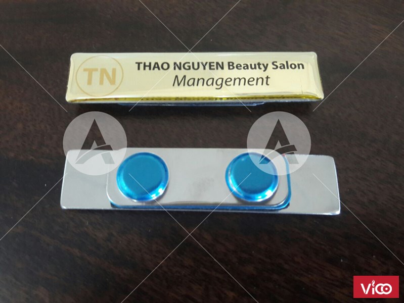Bảng tên nhân viên bằng kim loại (inox, đồng…): là loại bảng tên bền đẹp, rất chắc chắn, có thể chịu được tác động mạnh, mà không bị gãy. Mặt trước thẻ in decal hoặc in UV trực tiếp phủ keo, trong suốt đảm bảo độ bền, bóng đẹp cho thẻ. Mặt sau gắn nam châm hay kim cài.
