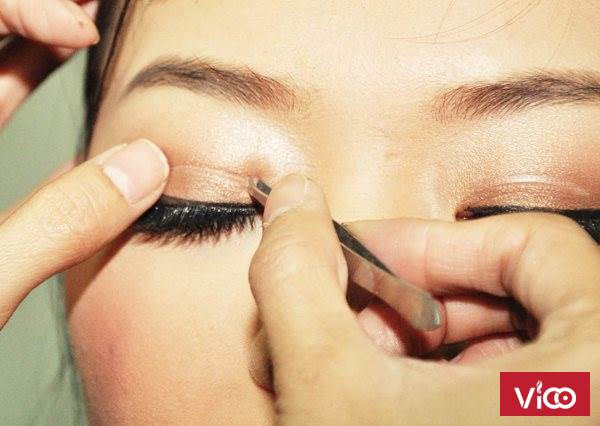 - Dùng nước xịt cho ướt đều mí, sau đó dùng tay dán mí ren lên mí giả của mình. Sau 5s bạn mở mắt lên và sẽ thấy hiệu quả của nó.