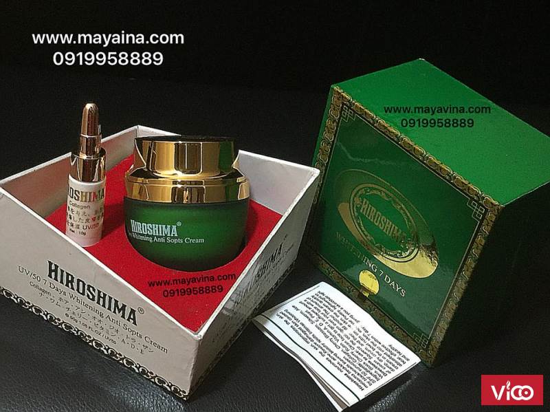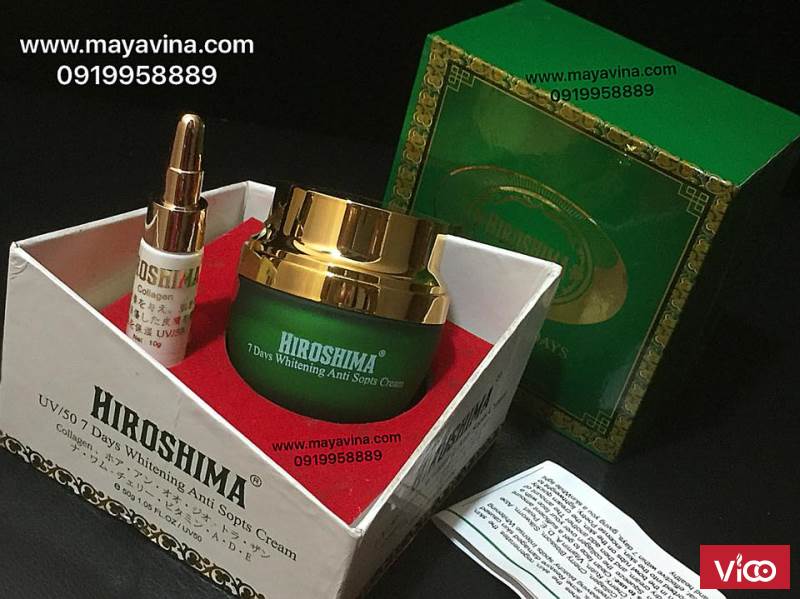 Kem HIROSHIMA cream, Được chiết xuất từ các thành phần Collagen, Hoa Anh Đào, Mã Tằm, Nha Đam, cherry Đen, Rutin, Vitamin A, D, E Pearl. ... nuôi dưỡng da, tái tạo da, trị nám, tàn nhang, trị mụn, phục hồi da hư tổn do mụn đầu đen để lại, làm mờ các vết nám thâm cho lan da trắng hồng và sáng, chống năng cao SPF 50 bảo vệ da một cách tối ưu.