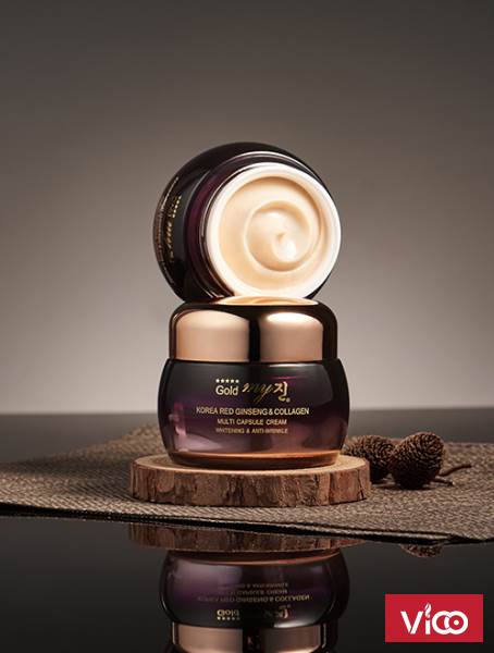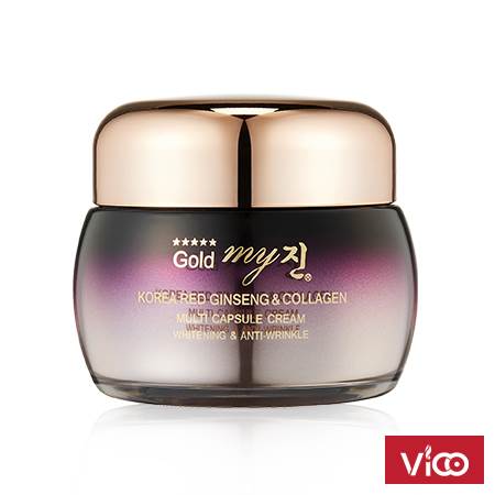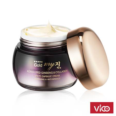 Công dụng: Hồng sâm Hàn Quốc ra quả duy nhất một lần trong 04 năm với lượng Polisacarit và Saponin cao gấp 15 lần so với tinh chất nhân sâm thông thường. Kem dưỡng cao cấp đặc biệt My Gold Multi Capsule Cream được tổng hợp từ: Tinh chất của Quả nhân sâm 06 năm tuổi, kết hợp với Vitamin và Collagen được cô đặc dạng hạt nang mềm được coi là phát kiến mới vô cùng độc đáo trong ngành mỹ phẩm Hàn Quốc.