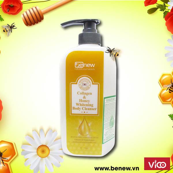Công dụng: Collagen thủy phân thẩm thấu sâu vào da, giúp giảm và làm mờ các nếp nhăn, nâng cơ và chống lại quá trình lão hóa da cực kỳ hiệu quả. Các Acid béo tự nhiên tạo lớp màng ẩm bảo vệ da chống lại các tác động bên ngoài, đồng thời nuôi dưỡng và bổ sung độ ẩm cho da, đẩy lùi các hiện tượng da thô ráp, thâm nám, trùng nhão và chảy xệ trên da. Mật ong có tác dụng làm sạch sâu và kháng khuẩn, phục hồi các tổn thương trên da như sắc tố da không đồng đều, đốm đen, sưng đỏ, da mụn, trứng cá…đồng thời giúp thu nhỏ lỗ chân lông. Sữa tắm BENEW Collagen & Honey sẽ giúp làn da được trẻ hóa, trắng sáng hồng hào hơn sau mỗi lần sử dụng. Thích hợp với mọi loại da.