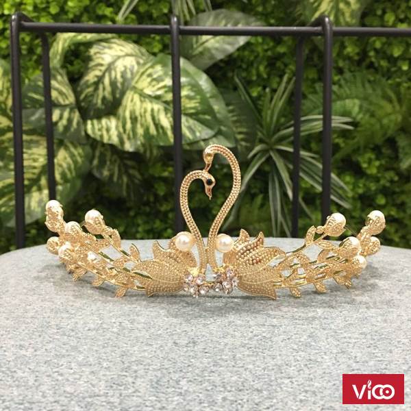 Vương miện màu ánh kim rất phù hợp với bộ váy cưới theo phong cách sang trọng và thường sử dụng trong tổ chức tiệc cưới trong nhà, giúp cô dâu lộng lẫy và thu hút ánh nhìn từ mọi người. các viên đá bằng chất liệu pha lê khi được cài lệch vừa làm mái tóc thêm sinh động mà còn tạo nét trẻ trung và nữ tính cho cô dâu.
