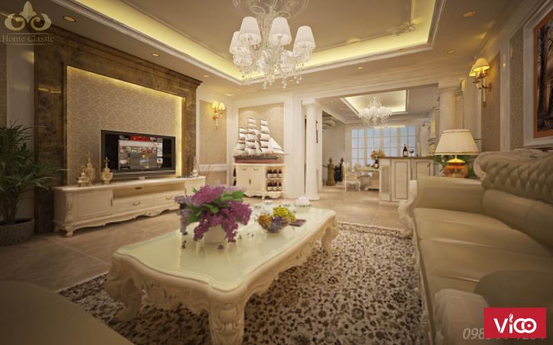 Với bộ sofa tân cổ điển sang trọng bề thế, cùng những đường nét hoa văn tinh tế, được đục đẽo tỉ mỉ trên chiếc kệ tivi, bàn trà duyên dáng, phong cách tân cổ điển đã chứng minh đượ c đẳng cấp của nó. Thông thường, với diện tích hạn chế của những căn chung cư, Homeclassic thường thiết kế đặt phòng thờ bên cạnh phòng khách nhờ vách ngăn họa tiết CNC và tranh vẽ, vừa tiết kiệm không gian, vừa tạo nên nét độc đáo cho căn nhà.