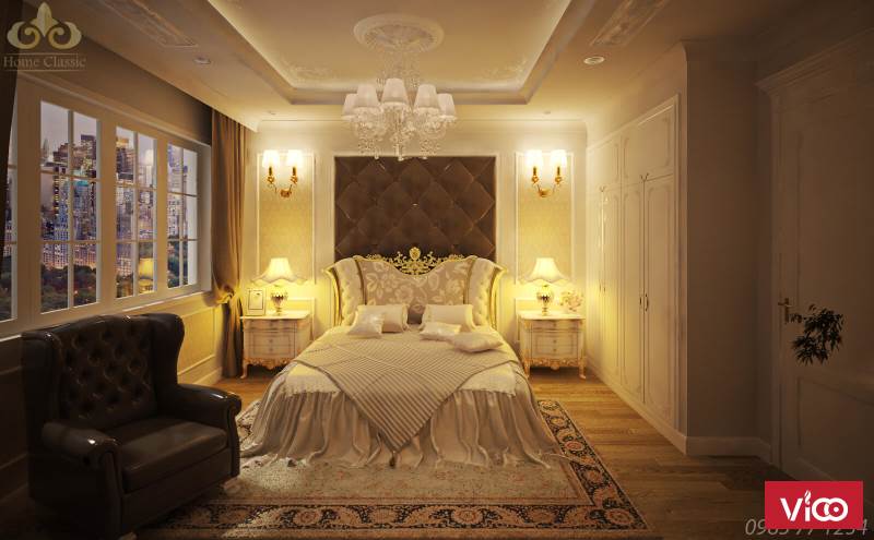 Khi thiết kế phòng ngủ tân cổ điển, chúng tôi đã thiết kế tủ quần áo âm tường giúp cho không gian rộng rãi và khoa học hơn. kết hợp với hệ tủ quần áo màu sáng là chiếc giường ngủ, hai bên là hai tab đầu giường xinh xắn tiện dụng.