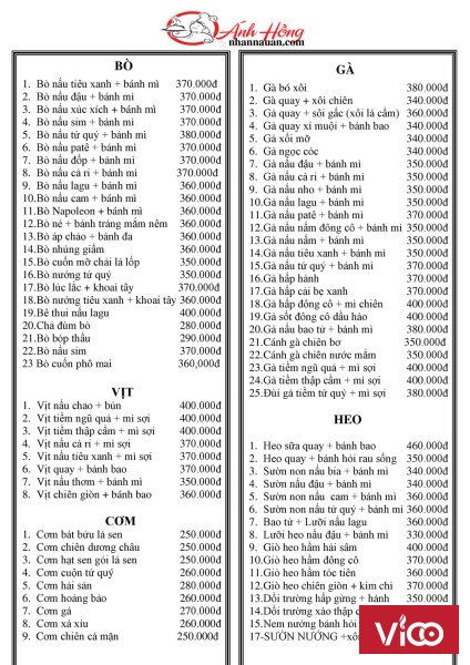 BẢNG THỰC ĐƠN