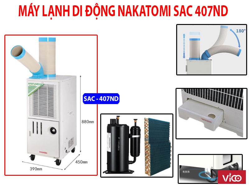 Máy lạnh di động là thiết bị làm mát không thể thiếu trong việc làm mát cho con người và các thiết bị phục vụ cho việc sản xuất công nghiệp. Có rất nhiều các thương hiệu máy lạnh di động đang được nhập và bán tại thị trường Việt Nam nhưng không vì thế mà máy lạnh di động Nakatomi trở nên lỗi thời, nhất là đối với mã sản phẩm có giá thành phải chăng như SAC 407ND nó còn mang lại hiệu quả cao trong khi sử dụng. Vậy nó được cấu tạo như thế nào, nguyên lí hoạt động ra làm sao,… ngay dưới đây là câu trả lời giúp quý khách hàng nắm bắt và hiểu về sản phẩm hơn.