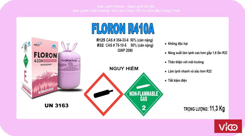 Gas lạnh Floron R410A của Ấn Độ là gas lạnh thế hệ mới thay thế cho gas R22 trong các hệ thống điều hòa, kho lạnh với nhiều ưu điểm vượt trội hơn: áp suất ngưng tụ cũng như độ lạnh(năng suất lạnh) cao hơn 1,6 lần và không gây nguy hại đến tầng Ozon. Gas R410A đang được khuyến khích sử dụng để bảo vệ môi trường nhằm mục tiêu phát triển bền vững. Được các hãng Sharp, LG, Panasonic sử dụng cho các dòng điều hòa thế hệ mới.