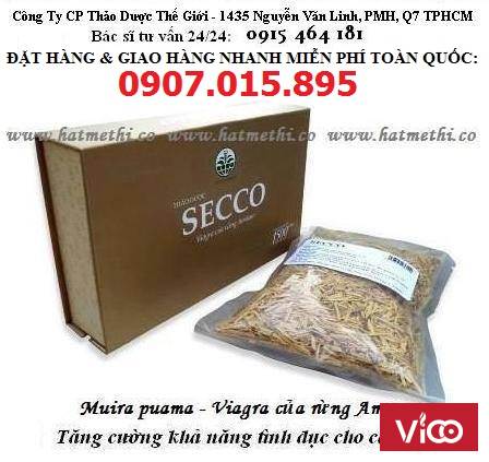 - Thảo dược SECCO - 100% Muira puama được xem là " Viagra của rừng Amazon" nhờ cung cấp một giải pháp trị liệu hoàn toàn tự nhiên và hiệu quả giúp tăng cường thể lực và khả năng sinh hoạt giường chiếu, điều trị chứng giảm ham muốn ở cả nam và nữ. SECCO được đánh giá là " Số 1" trong các loại thảo dược kích thích khả năng giường chiếu được biết đến hiện nay.
